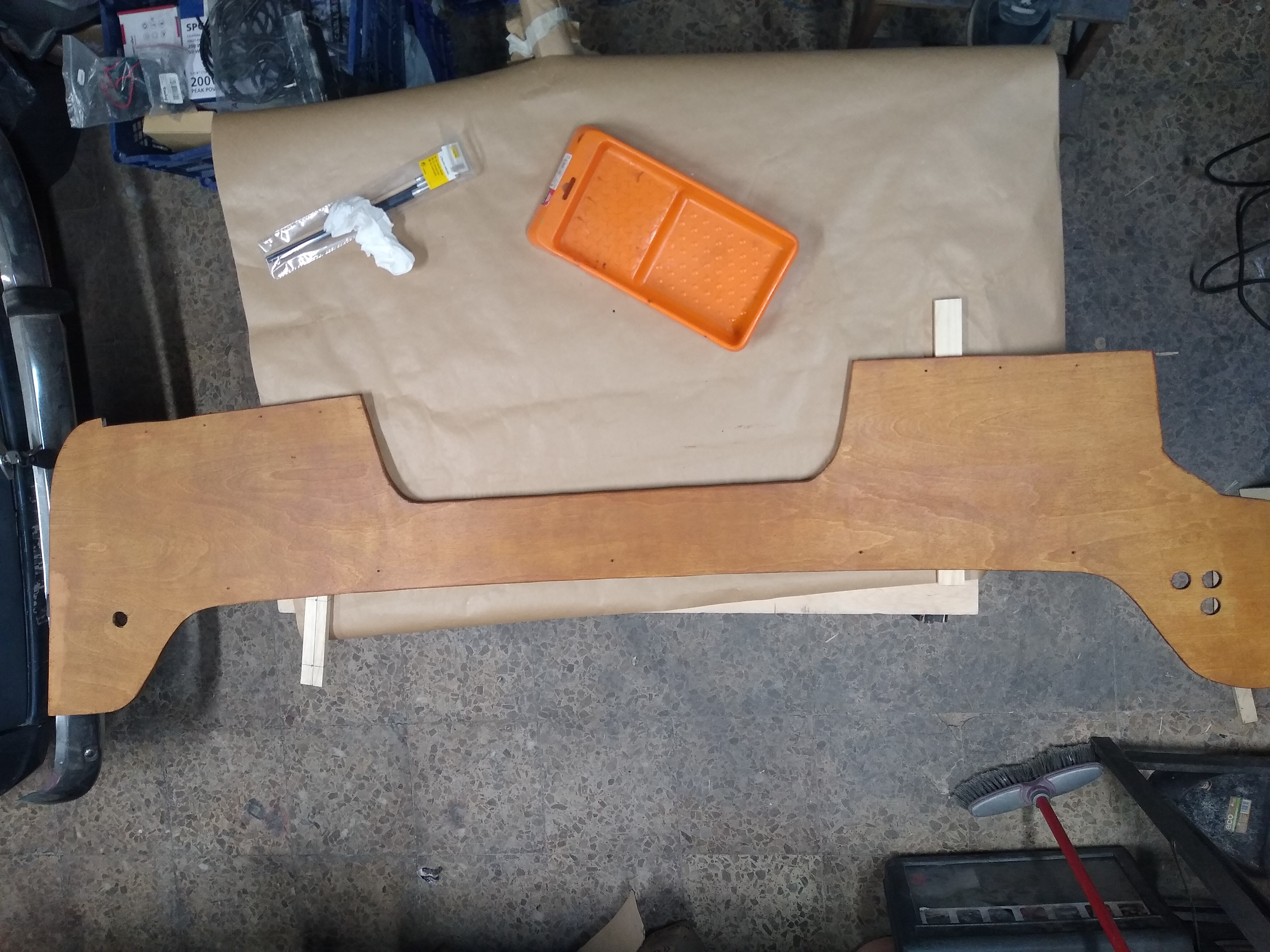 A estas alturas el panel lleva dos manos de un fondo anti mohos y carcomas y está a falta pintar y abrir dos nuevos agujeros que permitan el paso de los cables que den servicio a la bomba, a la sonda de nivel y a una futura luz en el maletero.